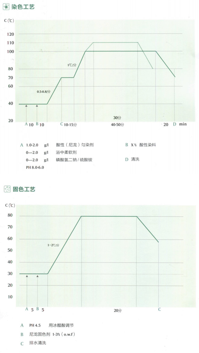 該產(chǎn)品屬于賽德倫E系列染料。該系列染料是高移染高牢度的金屬絡(luò)合染料,適合使用于極淺至中等深度染色。在不同染色深度,都有高等級的日曬牢度性能。高溫定型色變極小,特別適合內(nèi)衣面料的耐高溫壓模。淺色時可在PH=6-8左右染色。